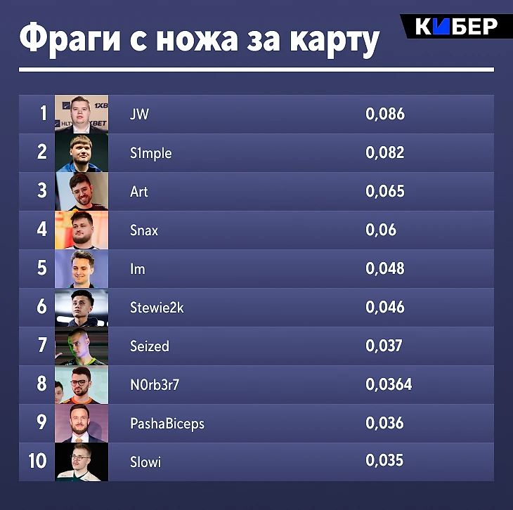 Забавно, но главный конкурент Симпла – Zywoo – совсем не любит такие фраги и зарезал всего 17 игроков – 0,01 за карту.