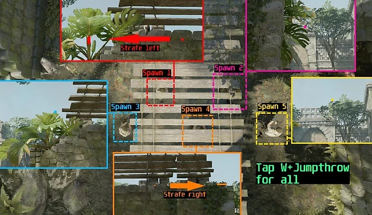 Все гранаты кидаются между третьим и пятым выступом, проще всего давать крайнему справа игроку – ему достаточно прицелиться в пятую точку. Нужно сделать два шага на шифте, после чего кинуть гранату в прыжке.