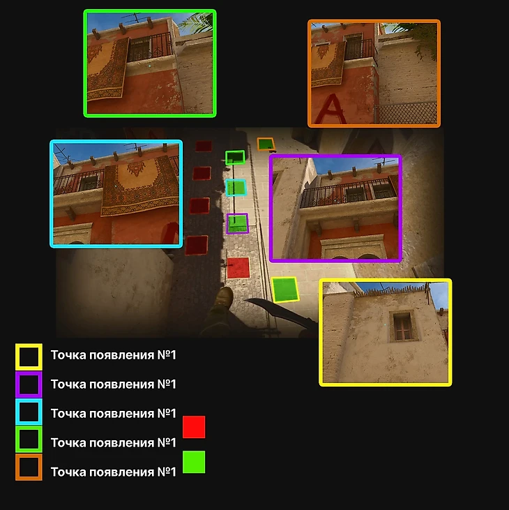 На остальных картах точки появления далеко от зон, куда нужно кидать смоки, либо нет ориентиров для броска гранаты.