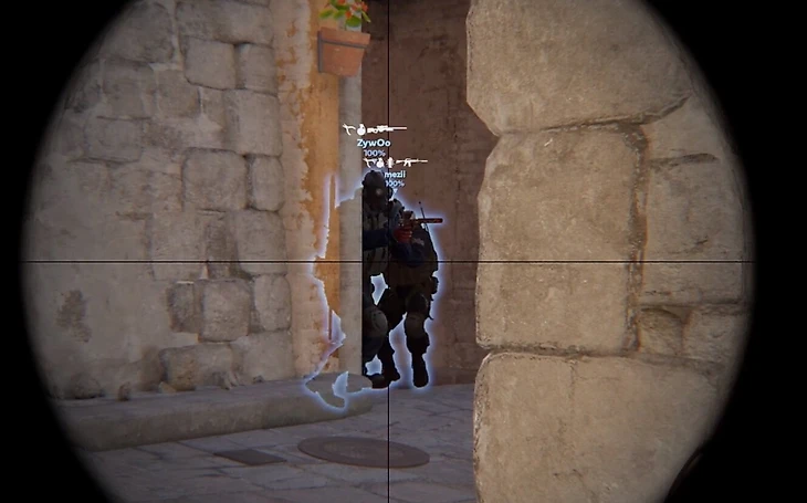Ставим на паузу. Прицел точно наведен на игрока позади и слегка касается его тиммейта.