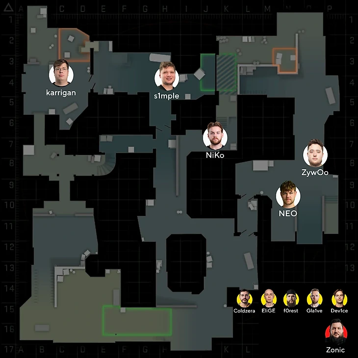 Вот так расположилась бы наша импровизированная команда на самой классической карте в CS. Сколько мейджоров бы урвали?