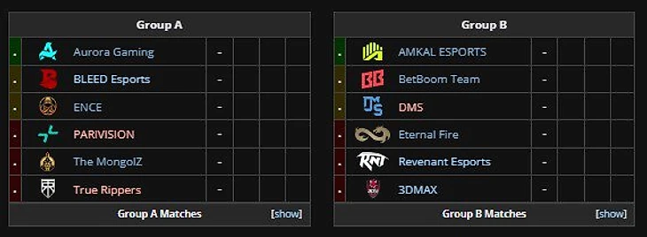 Все участники разделены на две группы. В группу А попали Aurora, Bleed, Ence, Parivision, TheMongolz и True Rippers. В группу B – Amkal, BetBoom Team, DMS, Eternal Fire, Revenant и 3DMax.