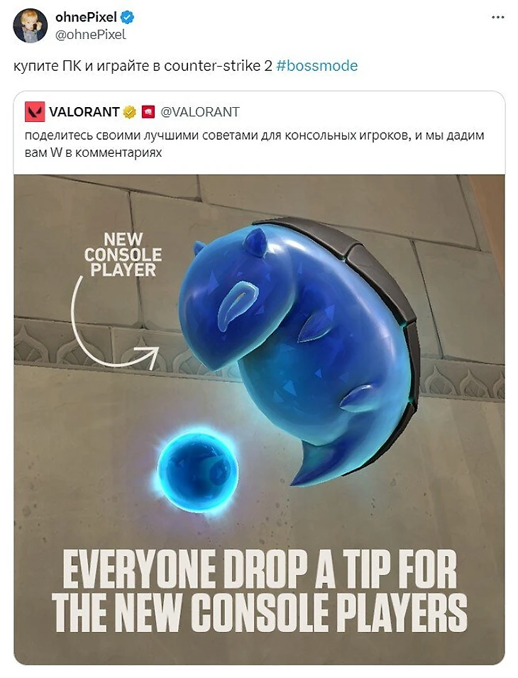 Он ретвитнул официальный аккаунт Valorant, просивший дать советы новым игрокам с консолей с очень простой рекомендацией: «купите ПК и играйте в Counter-Strike 2».