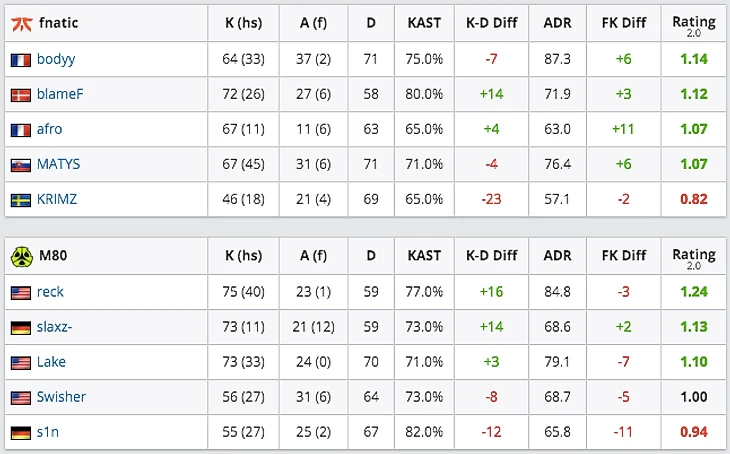 Fnatic и M80 отыграли 71 раунд на первой карте своего матча. В итоге американский ростер одержал победу со счётом 37:34. Карта длилась почти три часа, настолько долго, что организаторы решили предоставить дополнительный перерыв игрокам после 60-го раунда. 8 овертаймов и 477 фрагов - эту карту любители киберспорта запомнят надолго.