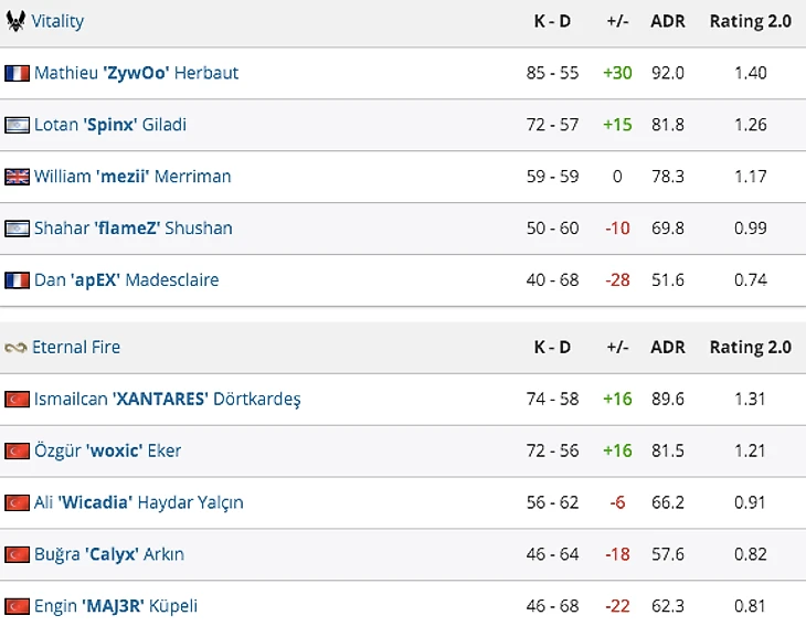 Позже, apEX признался, что это было одним из худших его выступлений за последнее время и что вину за проигрыш он берёт на себя. Но это не значит, что игра была недостойной. ZywOo был в прайме, да и остальные игроки Vitality показывали совсем не плохие результаты. И тем ценнее победа Eternal Fire. Они действительно оказались лучше отличной команды, которая играла в тот день очень хорошо.