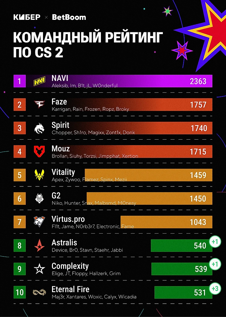 ● NAVI – лучшая команда мира с большим отрывом. Faze, Spirit и Mouz идут следом, а разрыв между ними всего 45 очков