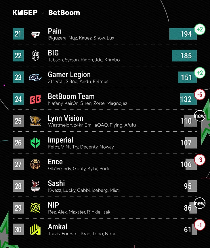 ● Lynn Vision вернулась в топ после нескольких месяцев отсутствия. То же самое касается и NIP – обе эти команды последние несколько рейтингов болтались в топ-35.