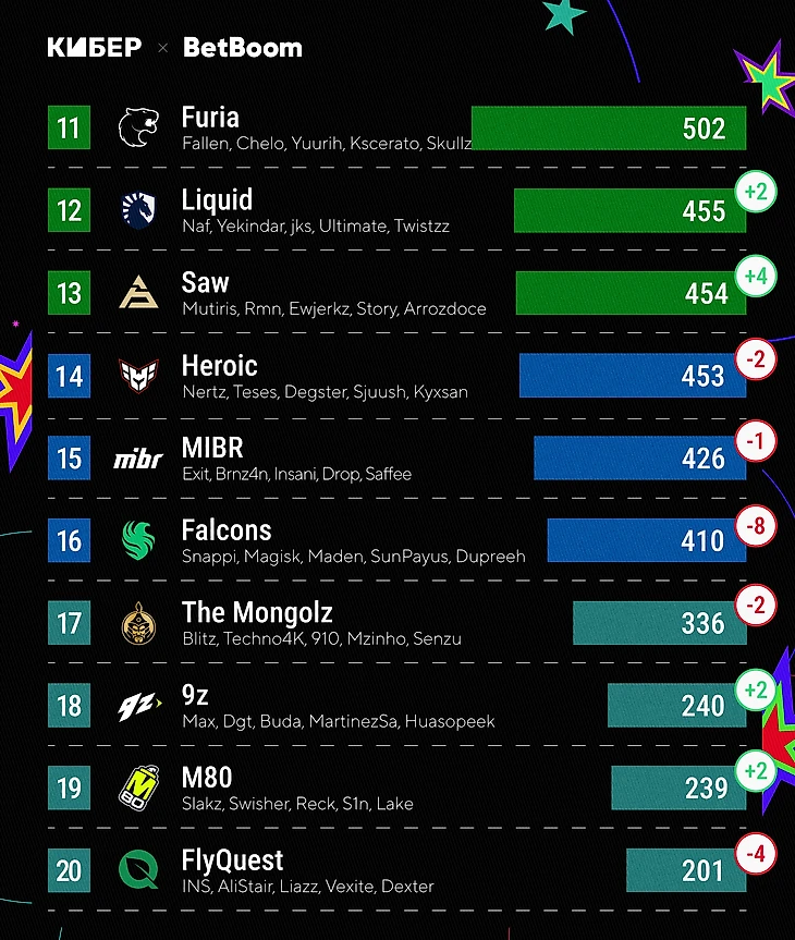 Если команда занимает диапазон мест, например 9-12-е, то ей присваивается среднее значение всех мест. Решаффлы учитываются: потеря одного игрока снимет 20% очков на турнирах, где он играл, двух – 40%, трех и более – обнулит результаты команды. Если кор перешел под другой тег, ему передадутся очки – так Falcons оказалась в топе, получив 60% от Ence.