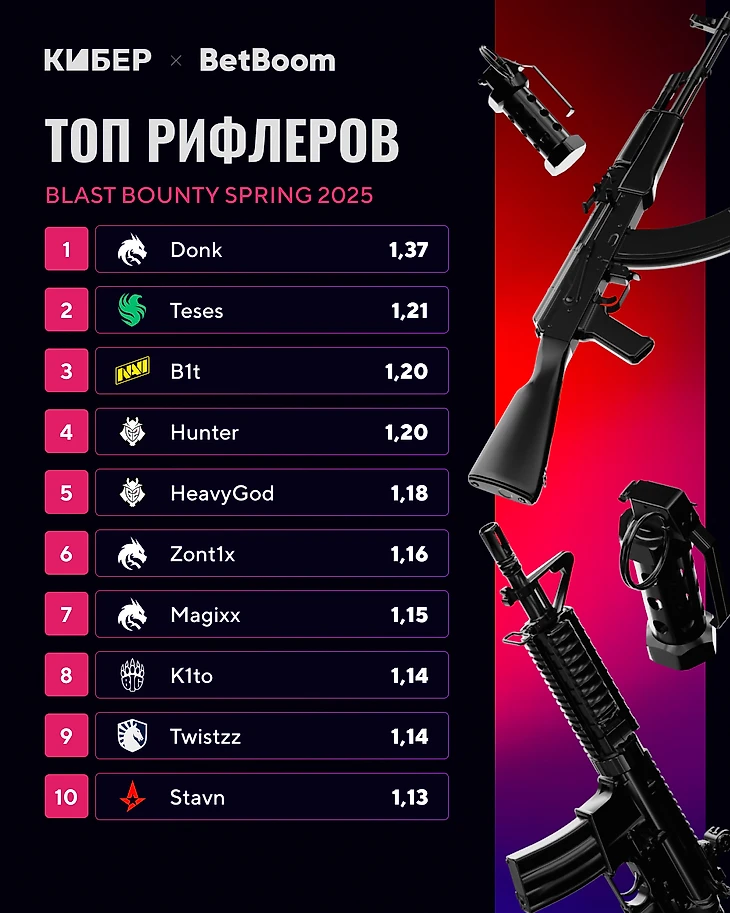 ● Hunter и HeavyGod в топе рифлеров с рейтингом 1,2 и 1,18, Snax в десятке капитанов, M0nesy – третий снайпер. Из G2 в топы не залетел Malbsmd – потенциальная замена Нико по ролям, у него всего 1,12.