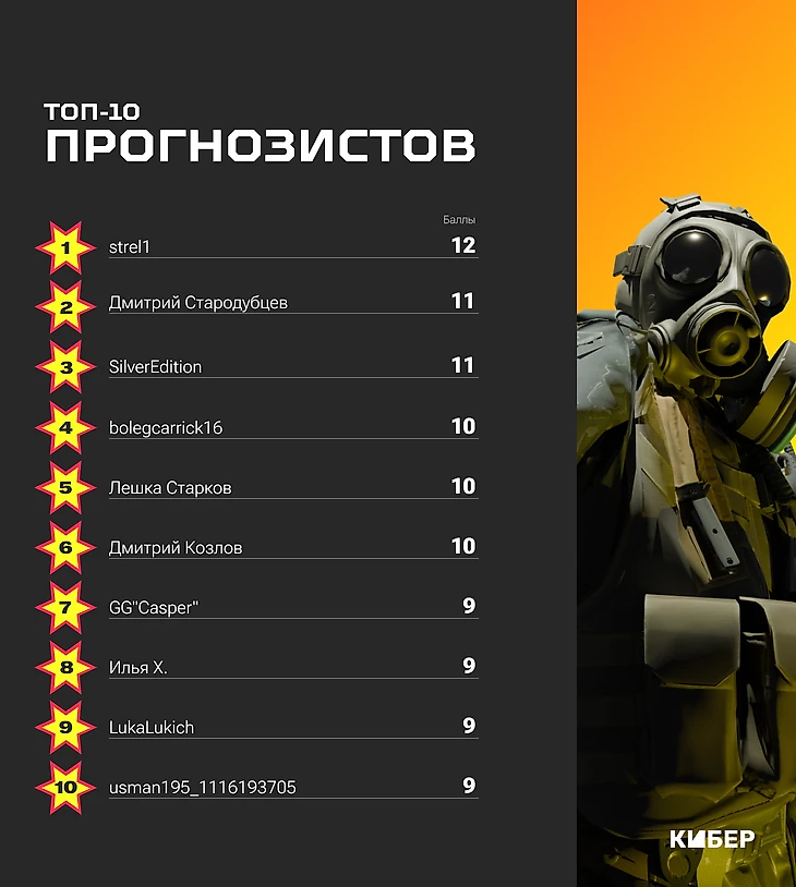При равенстве очков у двух или более участников выше в рейтинге будет тот, кто угадал больше точных результатов. При равенстве этого показателя выше окажется тот, кто угадает больше исходов в матчах формата bo3, затем в bo2, после в bo1. При равенстве всех показателей выше будет участник, который оставил прогноз на игровой день раньше конкурента.