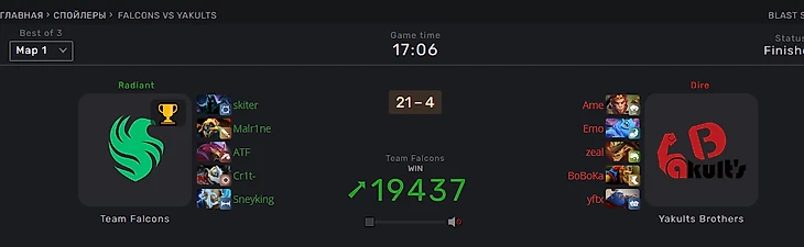 Глядя сюда можно понять что по пику все 3 линии,должны заканчиваться в пользу команды Falcons.Глядя в пике Huskar и Abaddon,можно сделать выводы что они могут это карту очень быстро закончить,т.к. герои довольны сильны на раннем этапе игры.Отсюда мы видим результат ПОБЕДА Falcons и очень быстрое завершение игры.