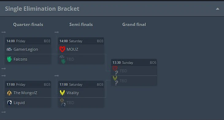 Mouz и Vitality вышли из группы без поражений и попали сразу в полуфинал. GamerLegion, Falcons, The Mongolz и Liquid начнут с четвертьфиналов. Матчи начнутся в пятницу в 10 утра по Москве.