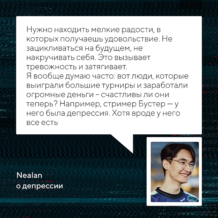 — Абсолютно. Я вообще думаю часто: вот люди, которые выиграли большие турниры и заработали огромные деньги – счастливы ли они теперь? Например, стример Бустер — у него была депрессия. Вроде у него все есть и деньги и популярность, но он все равно в таком состоянии. Мне помогла книга Экхарта Толле — «Новая земля» и «Сила настоящего». Очень классные книги, над которыми можно поразмыслить. Помогает найти внутренний покой. Я не со всем согласен, но некоторые мысли помогли.