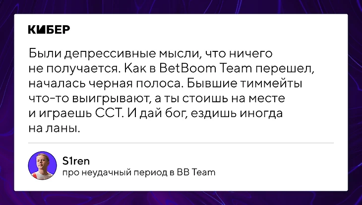– Прямо таких мыслей не было. Были всякие депрессивные мысли, что ничего не получается. Как в BetBoom Team перешел, началась какая-то черная полоса. Все твои бывшие тиммейты что-то выигрывают, а ты стоишь на месте и играешь CCT. И дай бог, ездишь иногда на ланы.