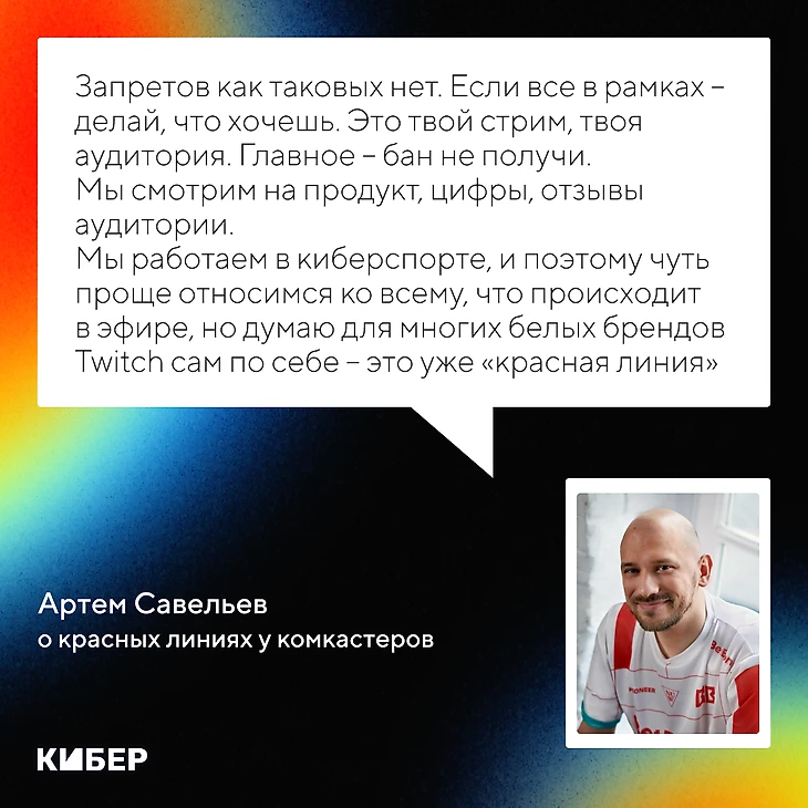 Мы работаем в киберспорте, и поэтому чуть проще относимся ко всему, что происходит в эфире, но, думаю, для многих белых брендов Twitch сам по себе – это уже «красная линия».