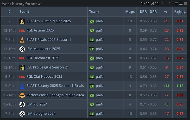 В 2024 они впервые встретились как соперники на мейджоре в Шанхае, причем сразу в матче на вылет. Snow закончил вторую карту на первом месте в своей команде, но Pain по итогу уступила с общим счетом 1-2. Сразу после матча Fallen очень тепло поддерживал молодого игрока.