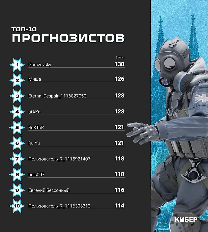 При равенстве очков у двух или более участников выше в рейтинге окажется тот, кто угадал больше точных счетов в формате bo3. В случае, если два и/или более участников угадали одинаковое количество точных счетов в формате bo3, то выше в рейтинге окажется тот, кто угадал больше исходов (правильно указал команду, которая победит в матче, но не угадал точный счет встречи) в матчах формата bo3. При равенстве всех вышеназванных показателей выше будет участник, который оставил прогноз на первый игровой день раньше по времени.