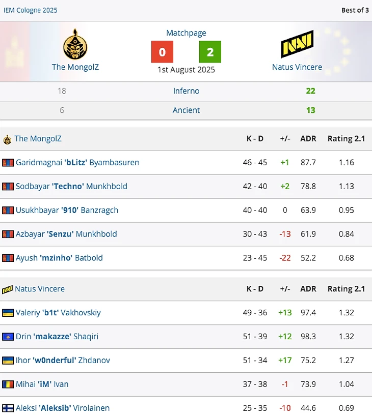 Ancient, к сожалению, получился не таким интересным. The MongolZ взяли всего один раунд в атаке, и хоть в защите у них что-то наконец начало получаться, было уже слишком поздно. Команда проиграла со счётом 6-13, несмотря на огромнейшую поддержку от родной страны (матч смотрели почти 3% от всего населения Монголии).