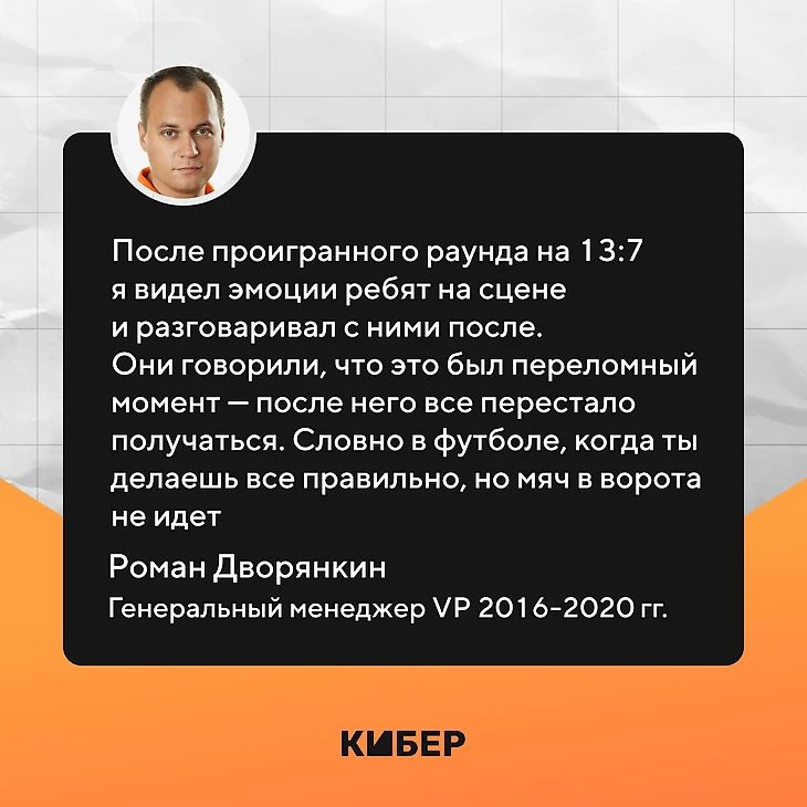 «После проигранного раунда на 13:7 я видел эмоции ребят на сцене и разговаривал с ними после. Они говорили, что это был переломный момент — после него все перестало получаться. Словно в футболе, когда ты делаешь все правильно, но мяч в ворота не идет», — резюмировал Дворянкин.