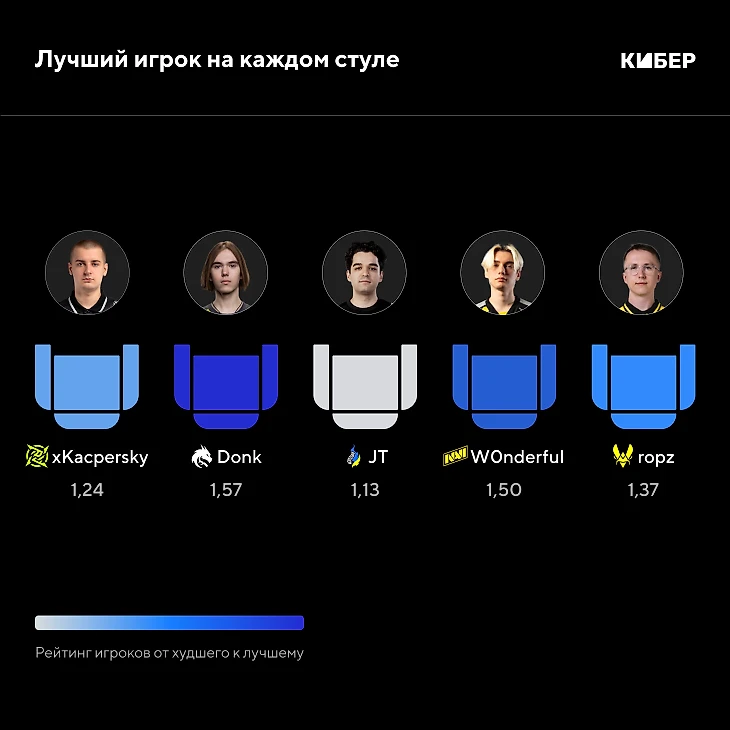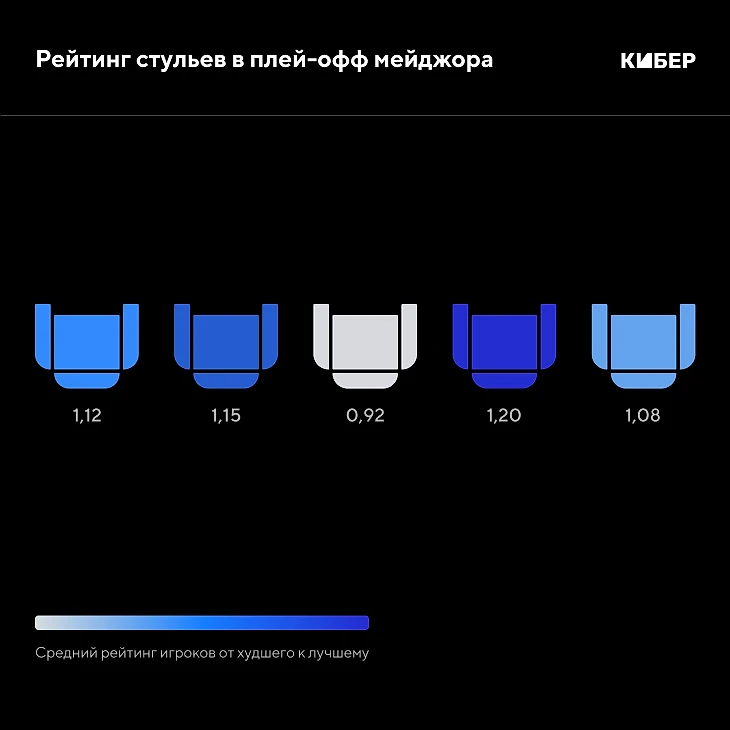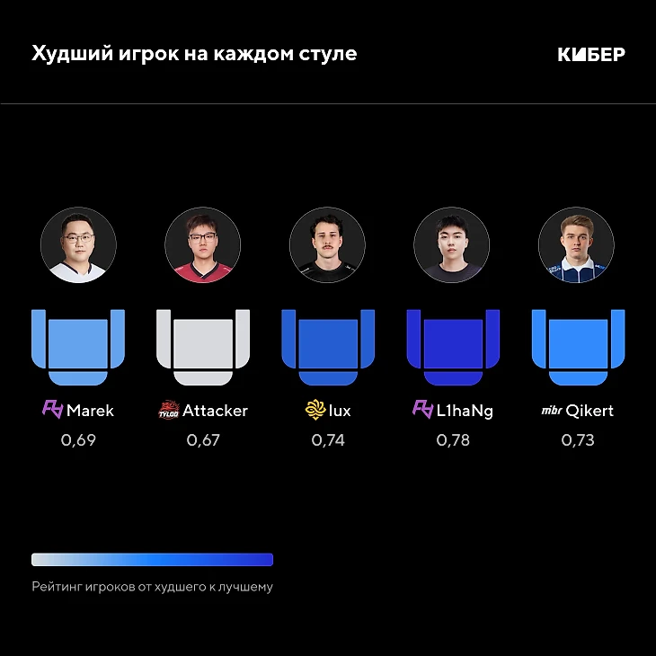• Из тех, кто сидел слева от центрального игрока, хуже всего сыграл Attacker – 0,67. Это худший рейтинг на турнире. Даже тренер Daps, сидевший на том же месте, набил 0,68.