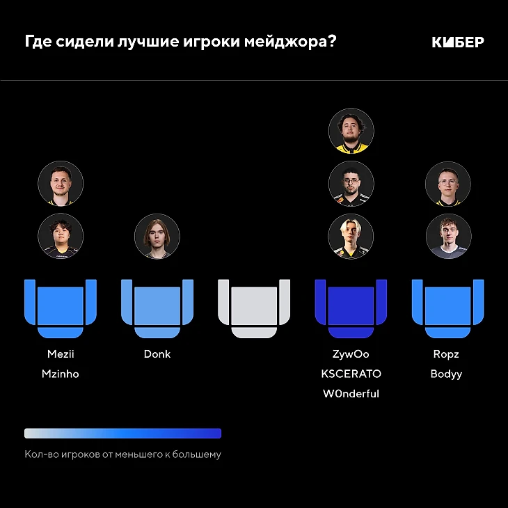 Правую половину выбрали 7 из 10 игроков – только Donk, Mezii и Mzinho пошли против системы. Самое популярное место среди десятки лучших – справа от центрального игрока. Там расположились трое: ZywOo, Kscerato и W0nderful.