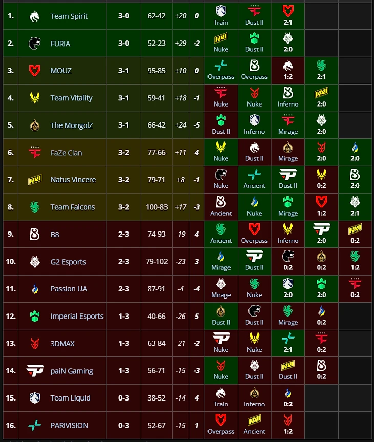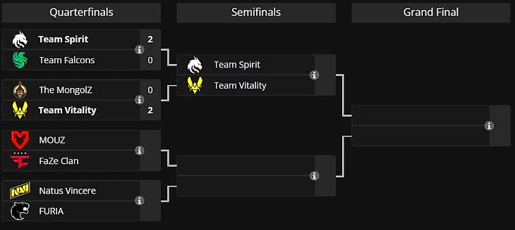 Участники плей-офф: Spirit, Falcons, The Mongolz, Vitality, Mouz, Faze, NAVI, Furia.