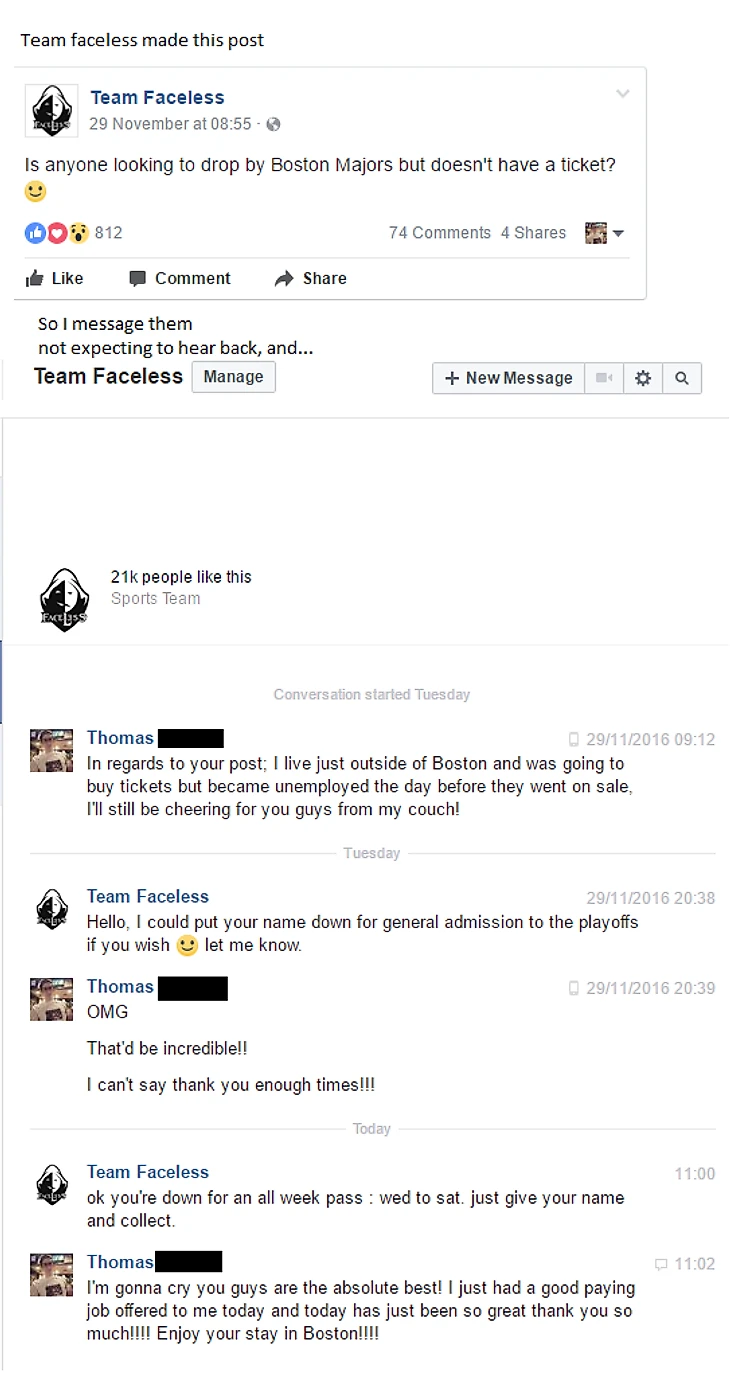 Пользователь реддит Theundercave выложил занимательную переписку с официальным аккаунтом Team Faceless. Организация опубликовала пост, в котором интересовалась, нужен ли кому-нибудь билет на The Boston Major. Фанат написал им, что хотел бы попасть на турнир, но недавно лишился работы. Он даже не надеялся на ответ, но Team Faceless не просто ответили, но и подарили ему доступ на все дни турнира.The Boston Major пройдет с 3 по 10 декабря. На турнире сыграют 16 команд со всего мира.