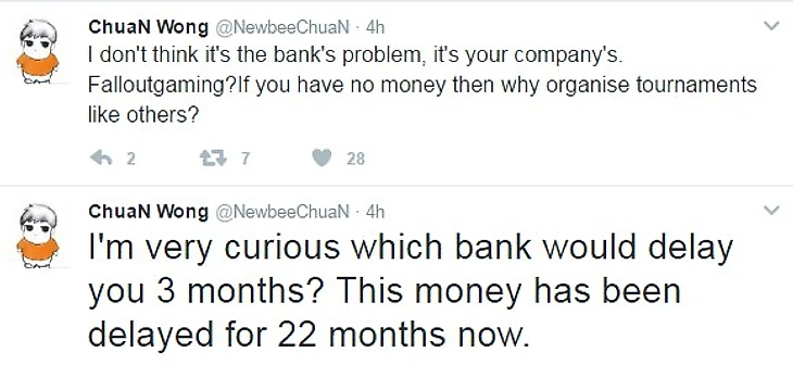 Бывший игрок Invictus Gaming Вонг «ChuaN» Хок Чуань на своей странице в твиттере опубликовал письмо от организаторов Major All Stars, в котором говорится, что банк еще три месяца назад одобрил перевод призовых денег, однако они до сих пор не дошли до получателя.