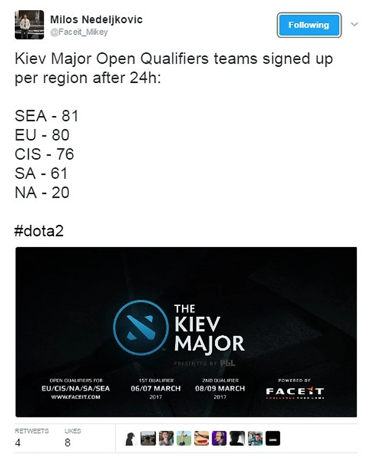 Сотрудник FACEIT Милош Неделькович опубликовал количество команд, которое зарегистрировалось для участия в первых открытых квалификациях The Kiev Major за сутки.