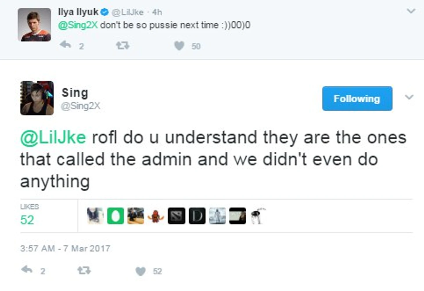 В этот на твит Ильи «Lil» Ильюка SingSing ответил: «Ты понимаешь, что они сами позвали администратора, мы даже ничего не делали»