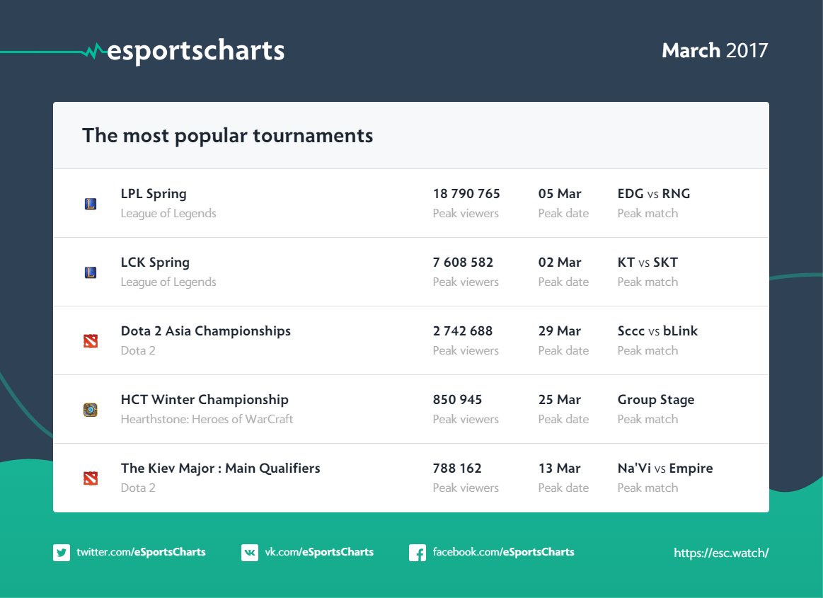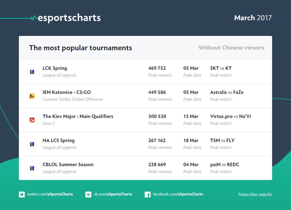 По всему миру, за исключением Китая, самым популярным турниром стала корейская лига LCK (League of Legends), где пиковым матчем стала игра между SKT и KT, которая собрала 469 752 зрителя. На втором месте – матч IEM Katowice по CS:GO между Astralis и FaZe Clan, который смотрело 449 586 зрителей. Третье место занял матч Virtus.pro – Natus Vincere в рамках квалификации на киевский мейджор по доте. Его пиковый показатель составил 300 530 зрителей.