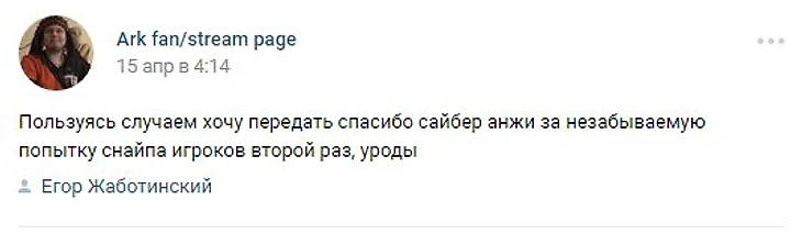 «Пользуясь случаем, хочу передать спасибо сайбер анжи за незабываемую попытку снайпа игроков второй раз, уроды», – написал игрок.