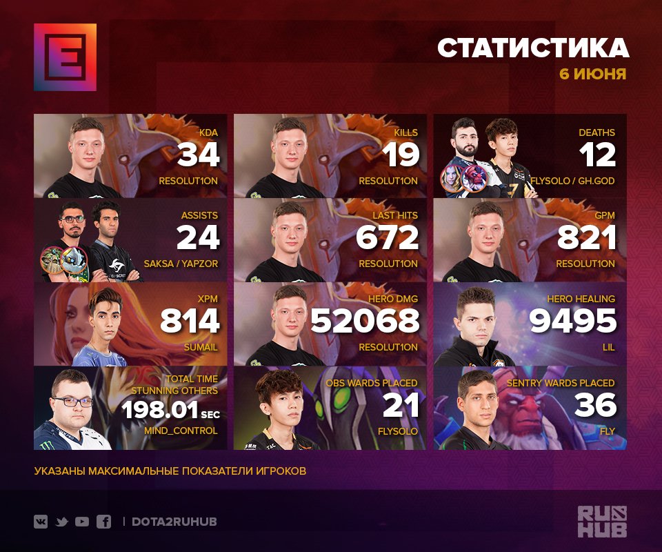 Лучшим по итогам дня стал керри Planet Odd Роман «Resolut1on» Фоминок с KDA, равным 34 и 19 убийствами. Украинец также стал лидером по числу добитых крипов, GPM и урону по героям.