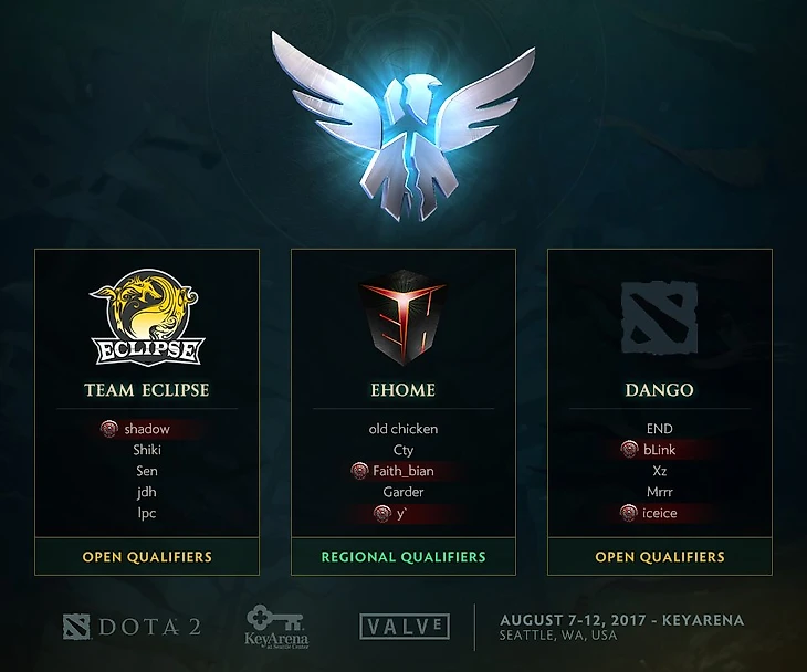 Ли «iceice» Пэн и Чжоу «bLink» Ян будут выступать в составе Team Dango, Чжан «Faith_bian» Жуйда и Чжан «y`» Липин сыграют в составе EHOME, а Чу «shadow» Цзэюй представит команду Eclipse.