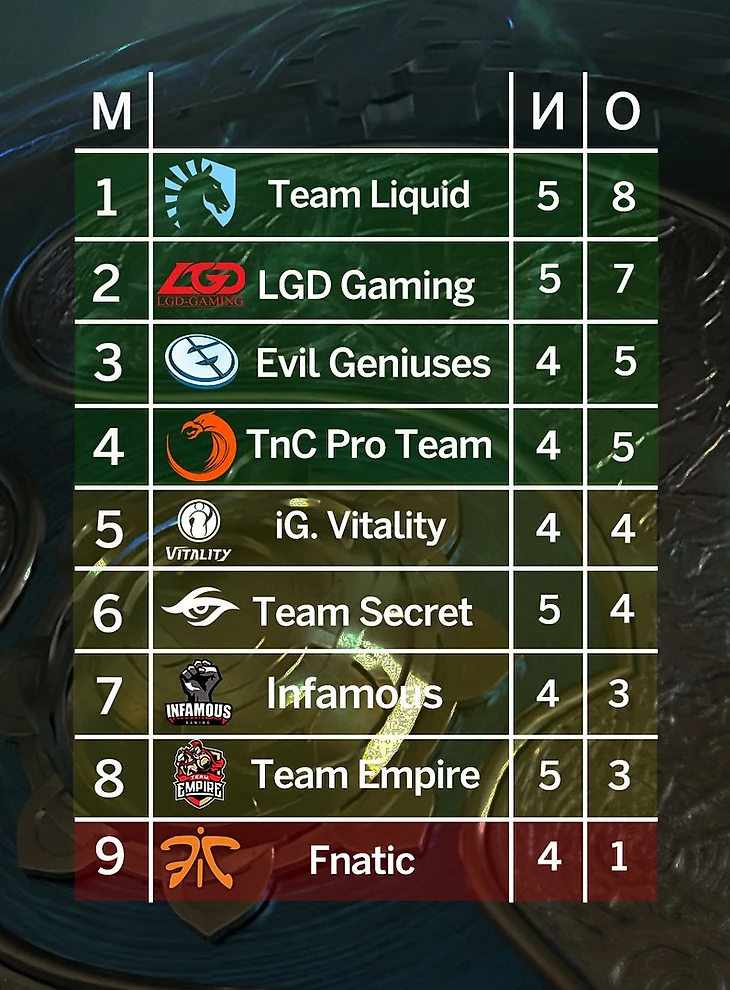 В группе А лидирует Team Liquid с результатом 8-2. В топ-4 также идут LGD (7-3), Evil Geniuses (5-3) и TNC (5-3).