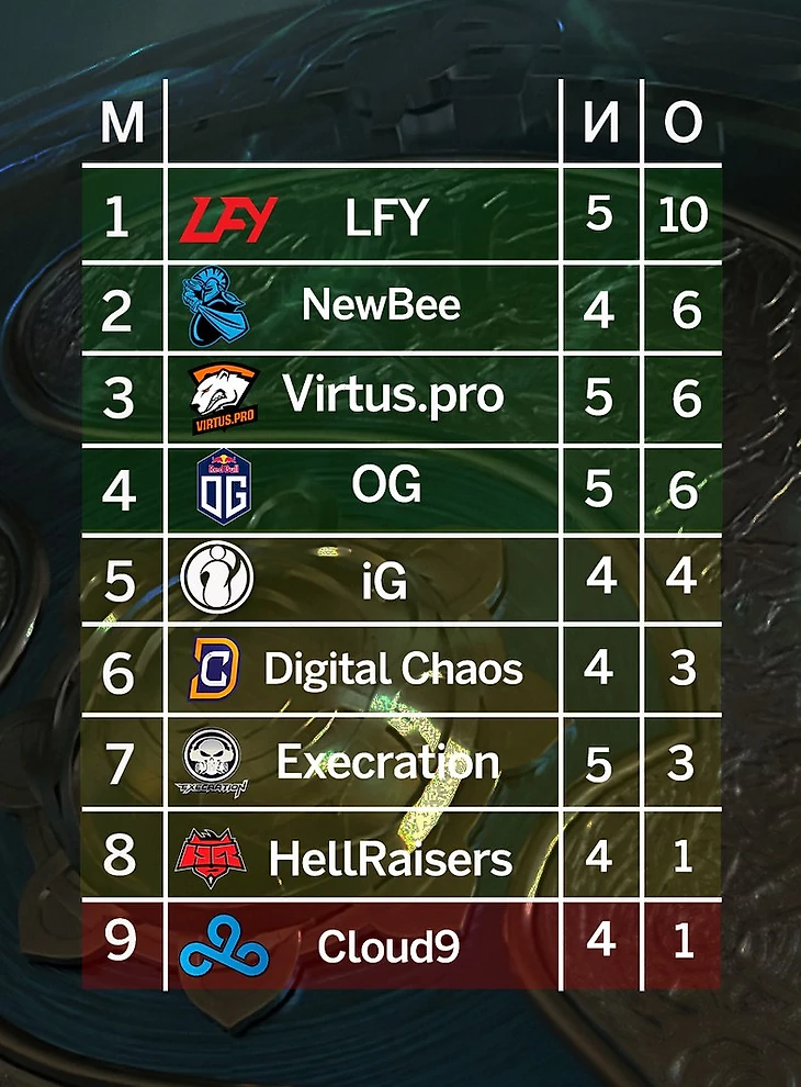 В группе B лидирует китайская LGD.FY, не проигравшая ни одной карты. За китайцами идут NewBee (6-2), Virtus.pro (6-4) и OG (6-4).