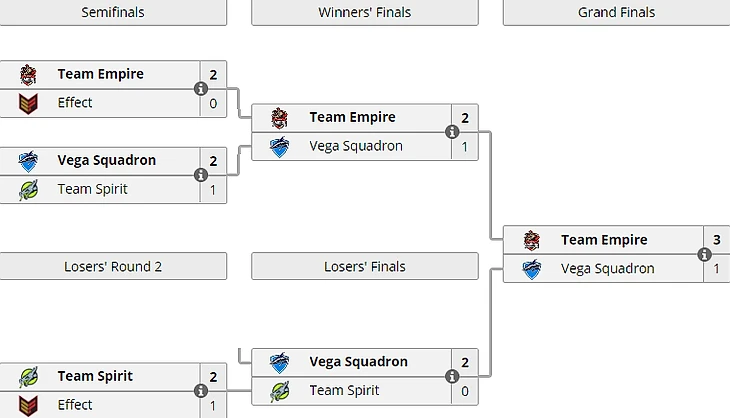 17:00 Vega Squadron 2:0 Spirit / Финал нижней сетки20:00 Team Empire 3:1 Vega Squadron/ Гранд-финал, Bo5Сетка