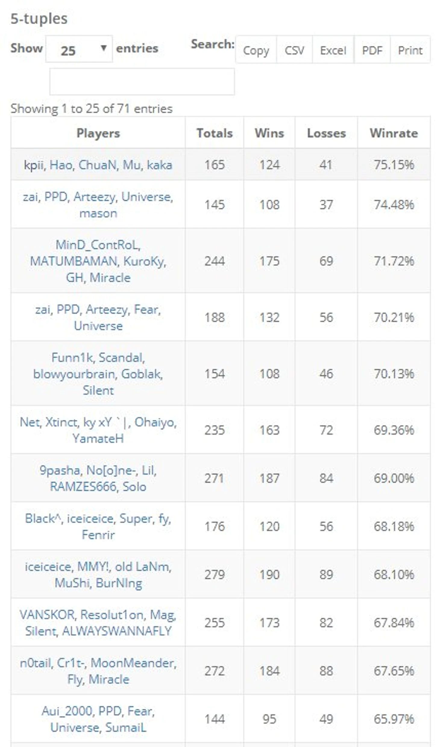 Solo, Lil, 9pasha, No[o]ne и Ramzes666 сыграли 271 матч с винрейтом 69% - это 7-е место в истории, 3-е – если считать только команды, сыгравшие вместе не меньше 200 карт.