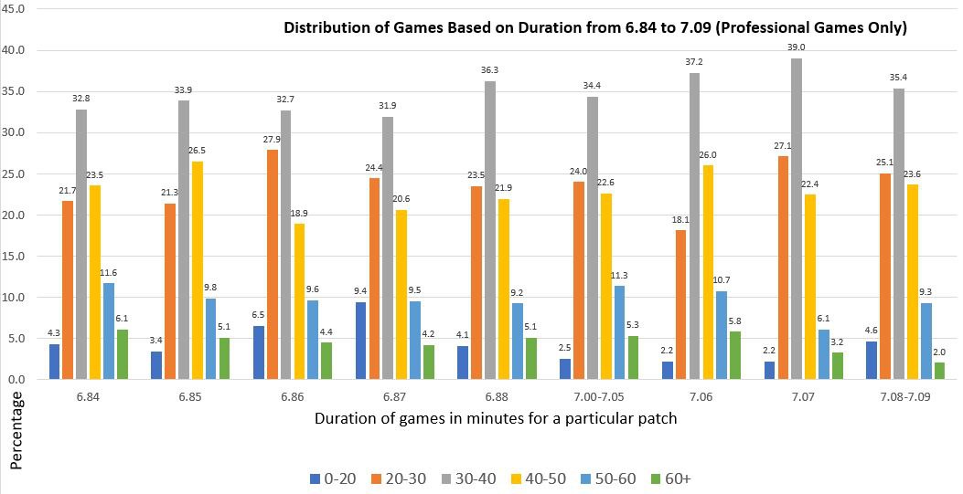 Если сравнить текущую версию игры с патчем 6.84, можно отметить примерно равную долю коротких игр (4,3% и 4,6% соответственно) и заметное уменьшение процента долгих матчей (6,1% против 2%).