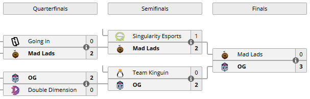 16:00 OG 2:0 Double Dimension / четвертьфинал19:30 Singularity Esports 1:2 Mad Lads / полуфинал23:00 Team Kinguin 0:2 OG / полуфинал