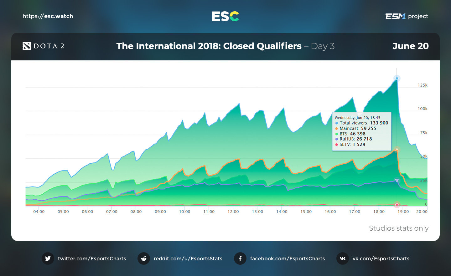 20 июня пик зрителей пришелся на матч за выход в гранд-финал СНГ-квалификации, в котором сразились Winstrike и Espada. Всего за матем следили 133 тыс. человек, из них 59 тыс. смотрели трансляцию студии Maincast, 46 тыс. наблюдали за ходом матча на стриме BeyondTheSummit, на стриме Рухаба было 26 тыс. человек, трансляцию SLTV смотрели лишь 1,5 тысячи зрителей.