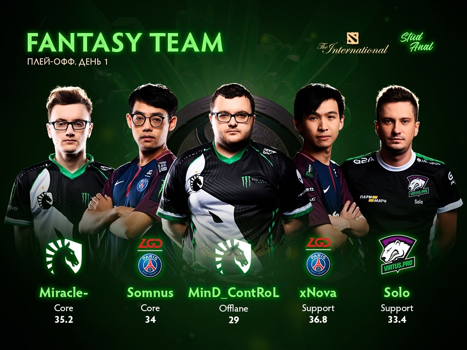 Miracle, xNova и Solo набрали больше всех фэнтези-очков на своих позициях в первый день плей-офф TI8
