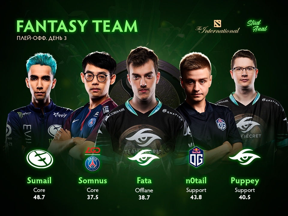 Он заработал 48,7 пойнтов. На втором и третьем месте по набранным фэнтези-очкам оказались игроки Йохан «n0tail» Сундштайн (43,8 очка) из OG и Клемент «Puppey» Иванов (40,5 очков) из Team Secret соответственно.