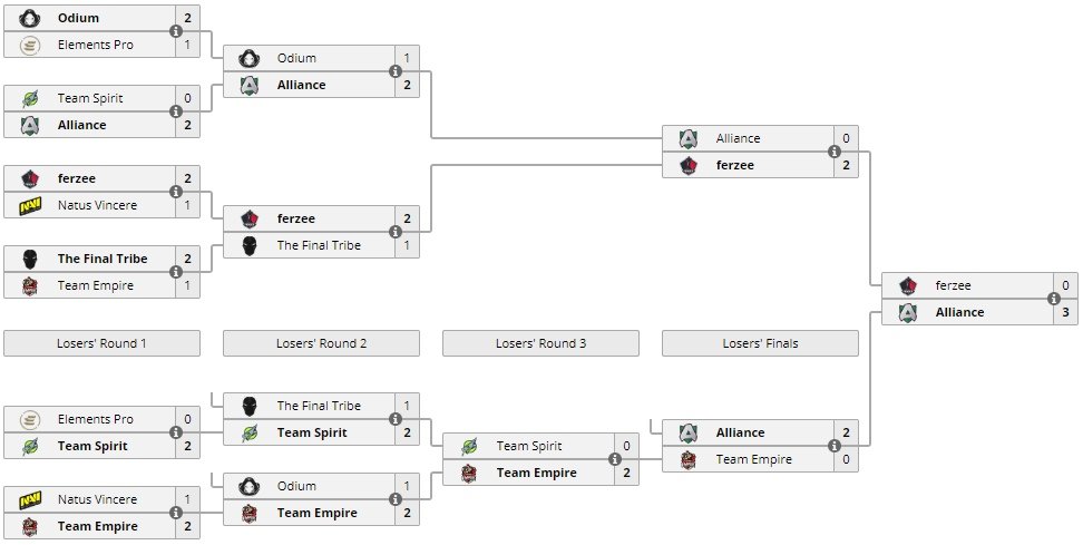 17:00 Alliance 2:0 Team Empire / Финал нижней сетки20:00 Ferzee 0:3 Alliance / Гранд-финал