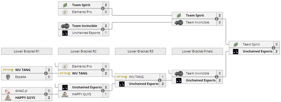 16:00 Unchained Esports 2:0 Team Invincible / Финал нижней сетки19:30 Team Spirit 0:2 Unchained Esports / Гранд-финал