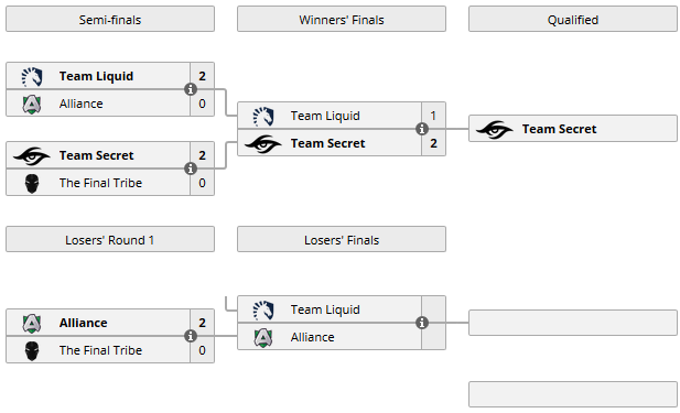 17:00 Alliance 2:0 The Final Tribe / Первый раунд нижней сетки17:00 Team Liquid 1:2 Team Secret / Финал верхней сетки20:30 Alliance – Team Liquid / Финал нижней сетки