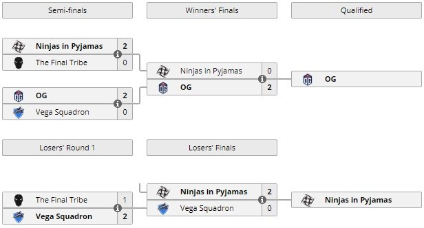 14:00 Vega Squadron 0:2 Ninjas in Pyjamas14:00 OG 2:0 Helsinki Reds16:30 Ninjas in Pyjamas 2:0 Hippomaniacs16:30 The Final Tribe 1:1 OG19:00 Vega Squadron 1:1 Hippomaniacs19:00 The Final Tribe 2:0 Helsinki Reds22:20 The Final Tribe 0:1 OG / Переигровка22:00 Vega Squadron 1:0 Hippomaniacs / Переигровка22:00 Ninjas in Pyjamas 2:0 The Final Tribe / Полуфинал верхней сетки23:00 OG 2:0 Vega Squadron/ Полуфинал верхней сетки