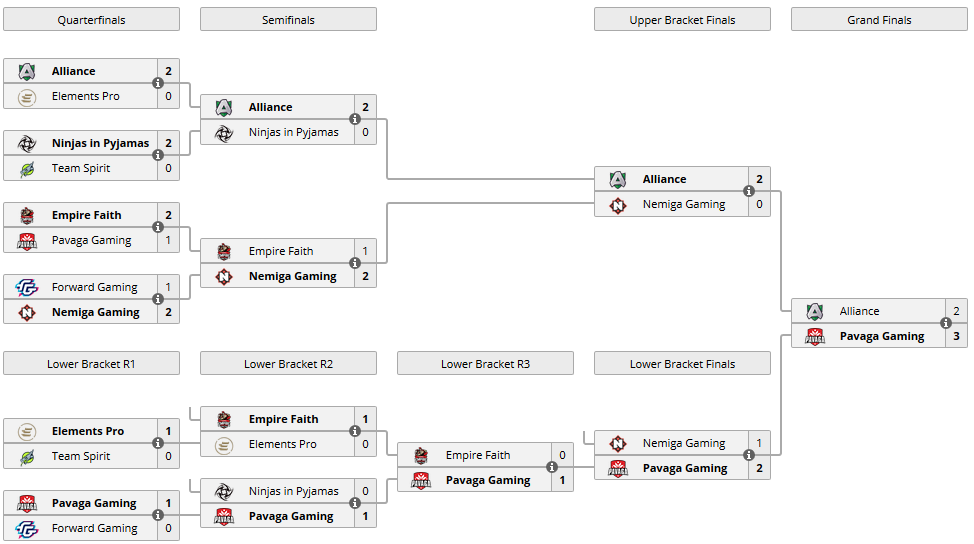 16:00 Team Empire Faith 1:0 EPG / Второй раунд нижней сетки18:00 Pavaga 1:0 Forward / Первый раунд нижней сетки19:15 Alliance 2:0 Nemiga / Финал верхней сетки21:30 Ninjas in Pyjamas 0:1 Pavaga / Второй раунд нижней сетки22:45 Pavaga 1:0 Team Empire Faith / Третий раунд нижней сетки00:00 Pavaga 2:1 Nemiga / Финал нижней сетки