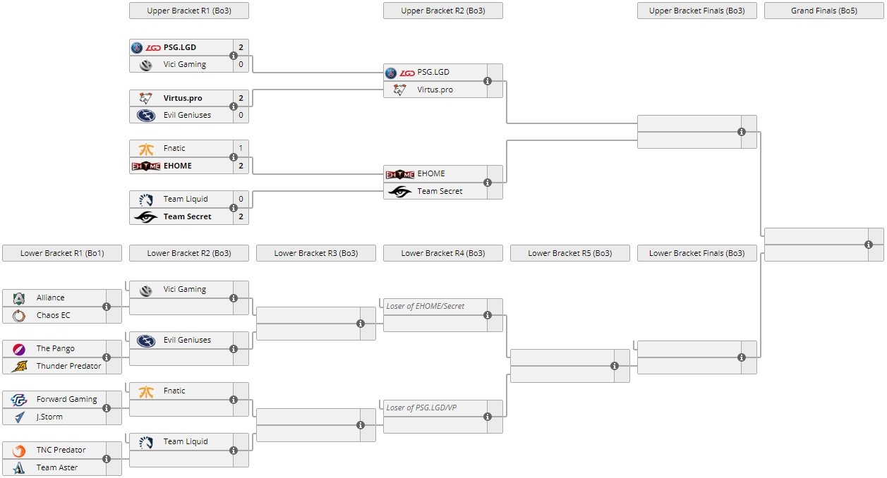 5:00 Team Secret 2:0 Team Liquid / Первый раунд верхней сетки8:00 Fnatic 1:2 Ehome / Первый раунд верхней сетки12:00 Virtus.pro 2:0 Evil Geniuses / Первый раунд верхней сетки15:30 PSG.LGD 2:0 Vici Gaming / Первый раунд верхней сетки