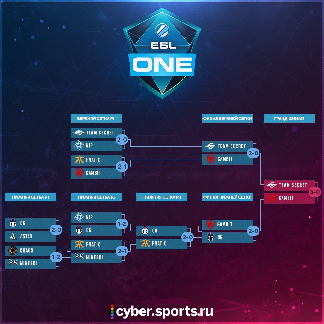 14:00 Team Secret 2:0 Gambit14:00 Mineski 2:0 Forward14:00 OG 2:0 For The Dream16:20 Fnatic 1:1 NiP16:20 Chaos 1:1 Alliance16:20 Team Aster 2:0 Complexity19:30 Team Secret 2:0 NiP / Полуфинал верхней сетки19:30 Fnatic 1:2 Gambit / Полуфинал верхней сетки